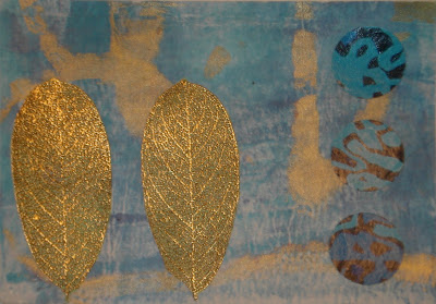 | Paint on rubber washer imprints, plastic mesh and paint imprints, rubber stamp images, gold embossing powder |
